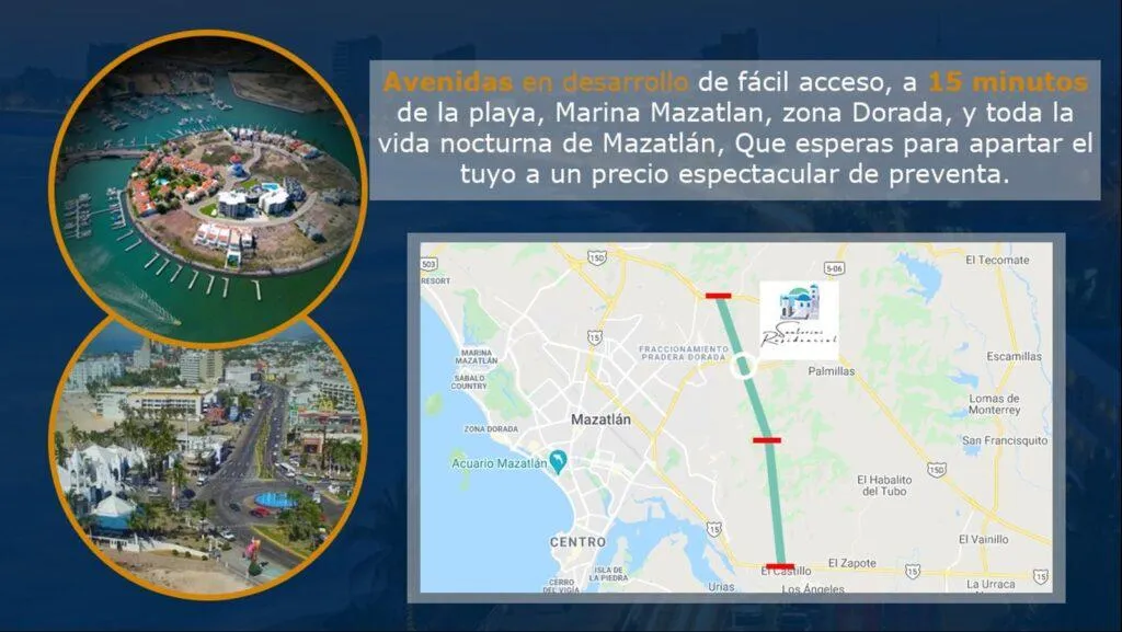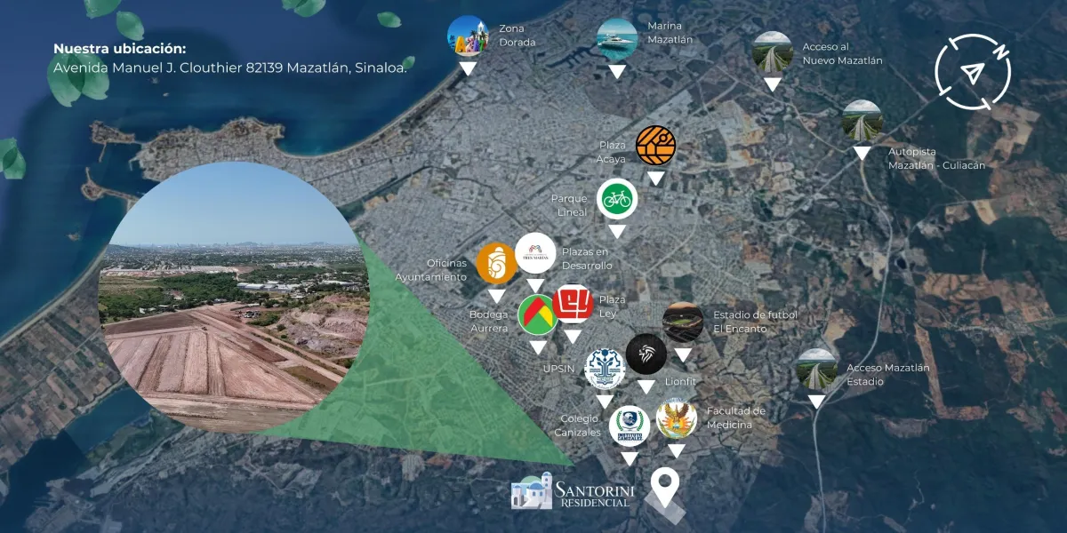 Santorini Residencial está ubicado en la Zona Oriente de la ciudad de Mazatlán, con salida al Nuevo Libramiento y beneficiado por el nuevo estadio de fútbol El Encanto.